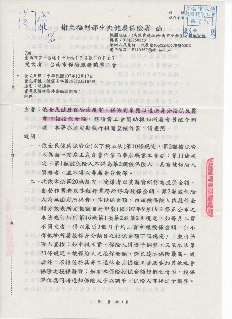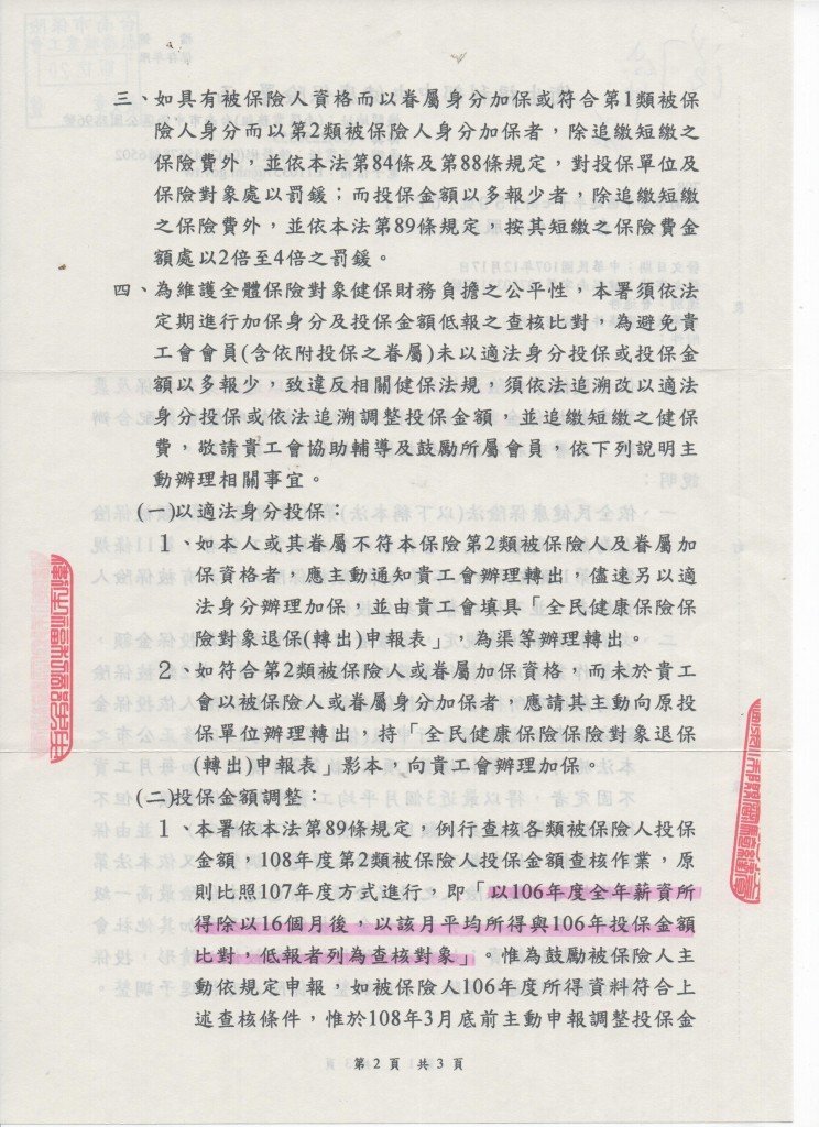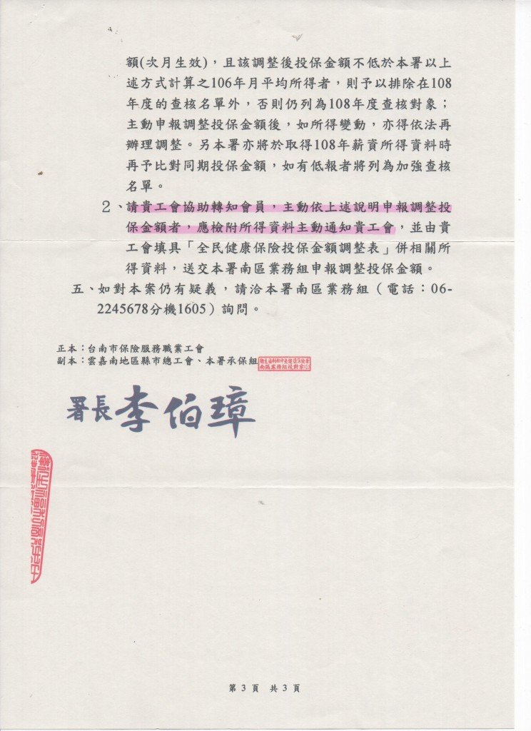 【依全民健康保險法規定,保險對象應以適法身分投保及覈實申報投保金額,健保署將定期執行相關查核作業,若需調整請於108年3月底前主動申報調整投保金額】。如有疑問請來電06-2985213。