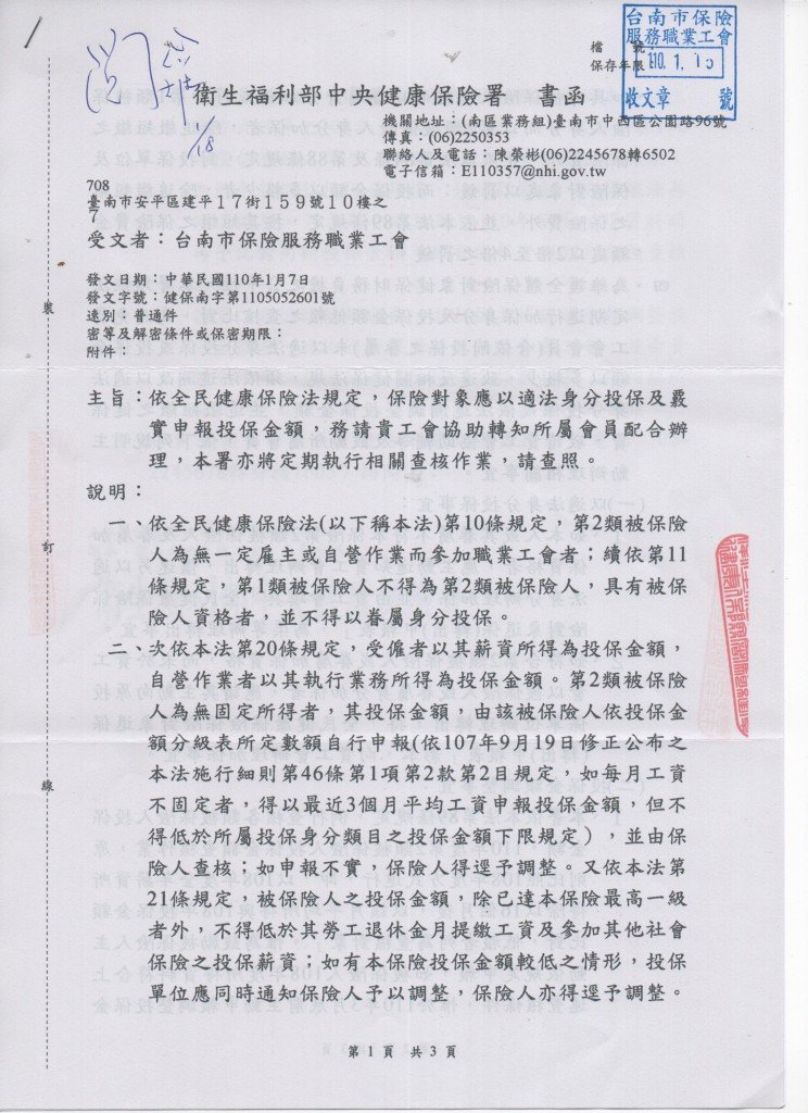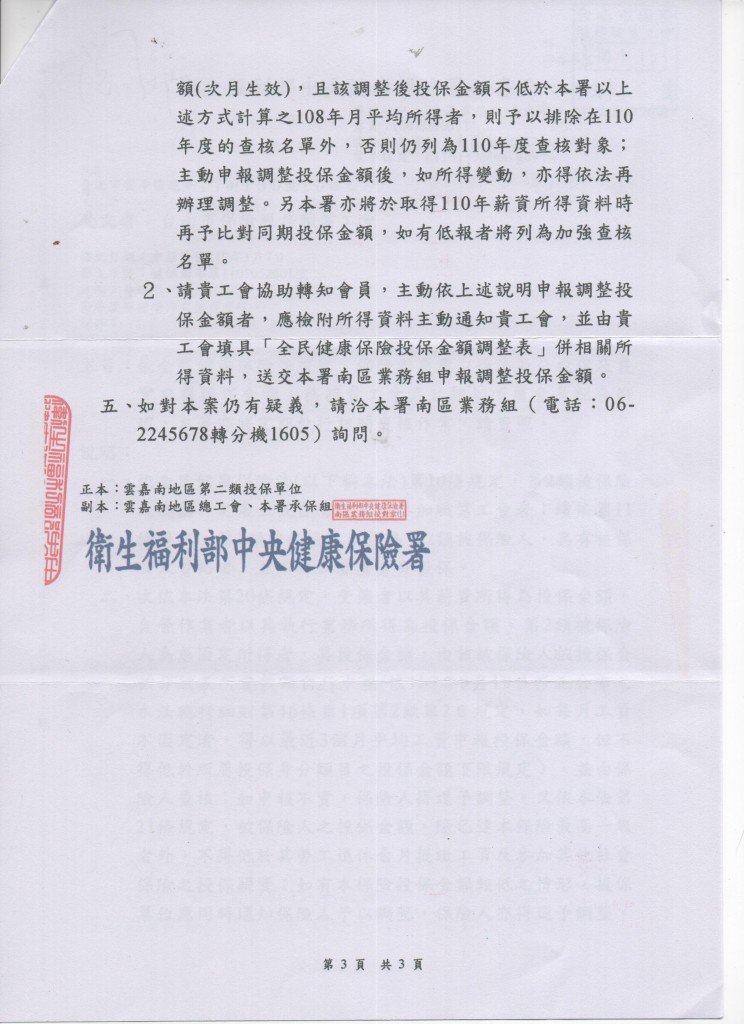 【依全民健康保險法規定,保險對象應以適法身分投保及覈實申報投保金額,健保署將定期執行相關查核作業,若需調整請於110年3月底前主動申報調整投保金額】。如有疑問請來電06-2985213。