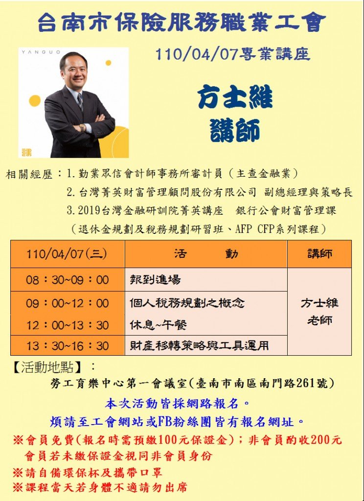 親愛的工會夥伴您好:本會訂於110/04/07辦理【110年度勞工教育講座,講師:方士維:【1.個人稅務規劃之概念】【2.財產移轉策略與工具運用】因座位有限,即日起開始報名至額滿為止,線上報名成功後需於10天內繳費完才算報名完成。