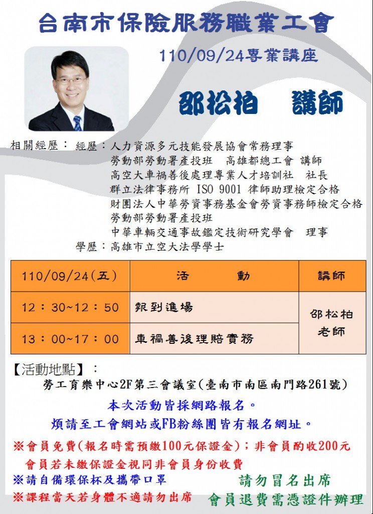 親愛的工會夥伴您好:本會訂於110/09/24辦理【110年度(2)勞工教育講座,講師:邵松柏:【車禍善後理賠實務】因座位有限,即日起開始報名至額滿為止,(本次活動採網路報名,煩請至工會網站或FB粉絲團皆有報名網址及詳細DM)。