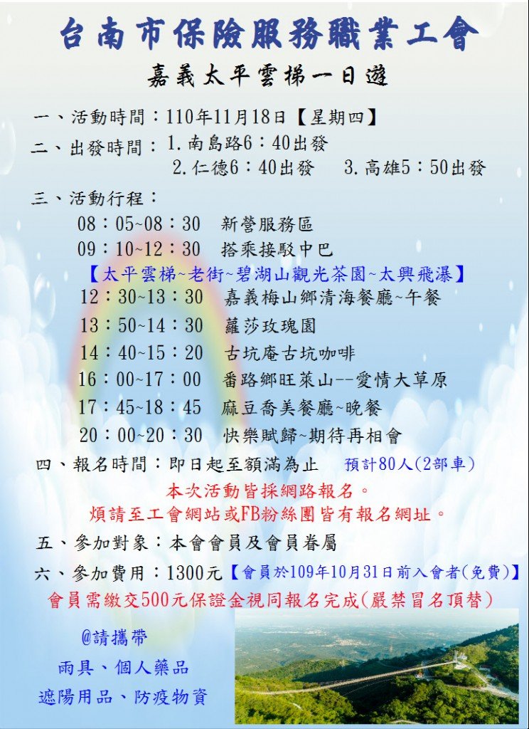 親愛的工會夥伴您好:本會訂於110/11/18(四)舉辦【嘉義太平雲梯】一日遊,即日起開始報名至額滿為止,(本次活動皆採網路報名,煩請至工會網站或FB粉絲團皆有報名網址及詳細DM)。