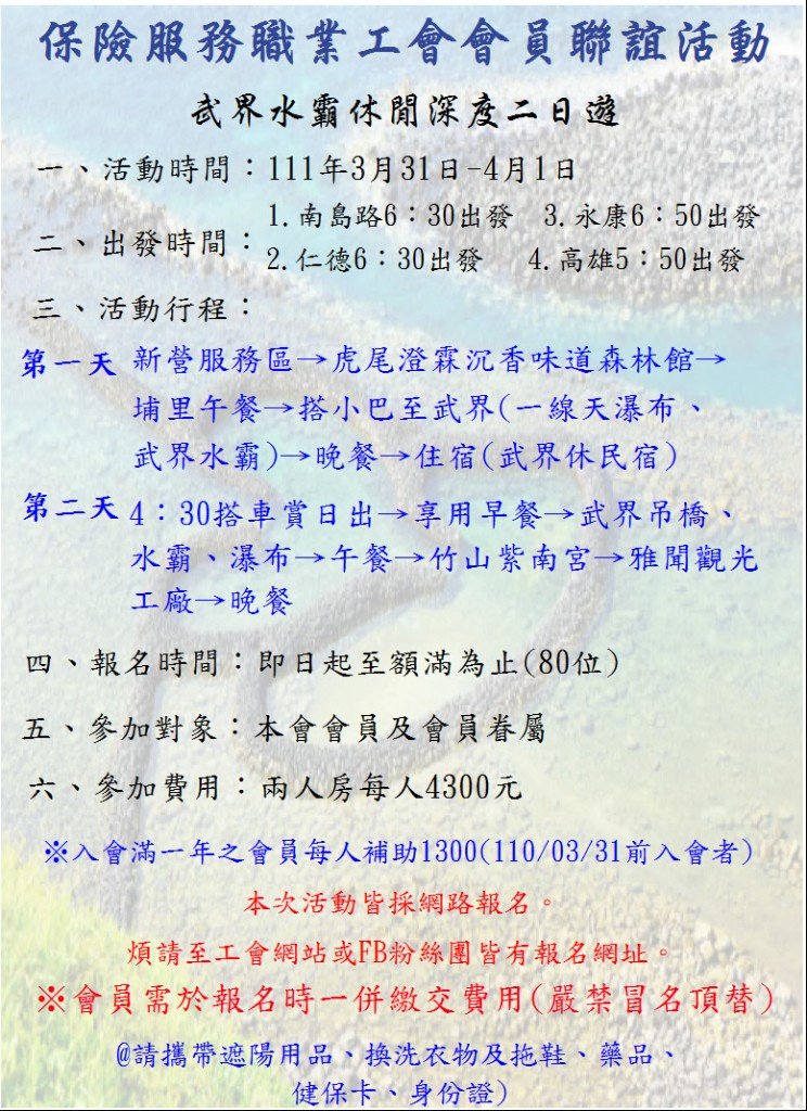 工會夥伴您好:本會訂於111/03/31~111/04/01武界水霸休閒深度二日遊,即日起開始報名至額滿為止,(本次活動皆採網路報名,煩請至工會網站或FB粉絲團皆有報名網址及詳細DM)。