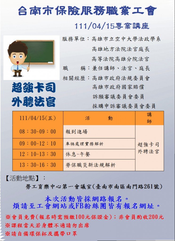 親愛的工會夥伴您好:本會訂於111/04/15辦理【111年度勞工教育講座,講師:楊富強:【車禍處理實務解析】、【勞保職災新法規解析】因座位有限,即日起開始報名至額滿為止,(本次活動採網路報名,煩請至工會網站或FB粉絲團皆有報名網址及詳細DM)。