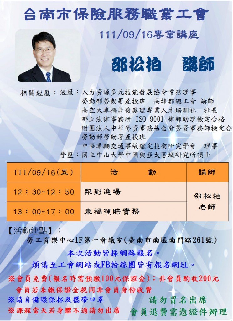 親愛的工會夥伴您好:本會訂於111/09/16辦理111年度(2)勞工教育講座,講師:邵松柏:【車禍理賠實務】因座位有限,即日起開始報名至額滿為止,(本次活動採網路報名,煩請至工會網站或FB粉絲團皆有報名網址及詳細DM)。