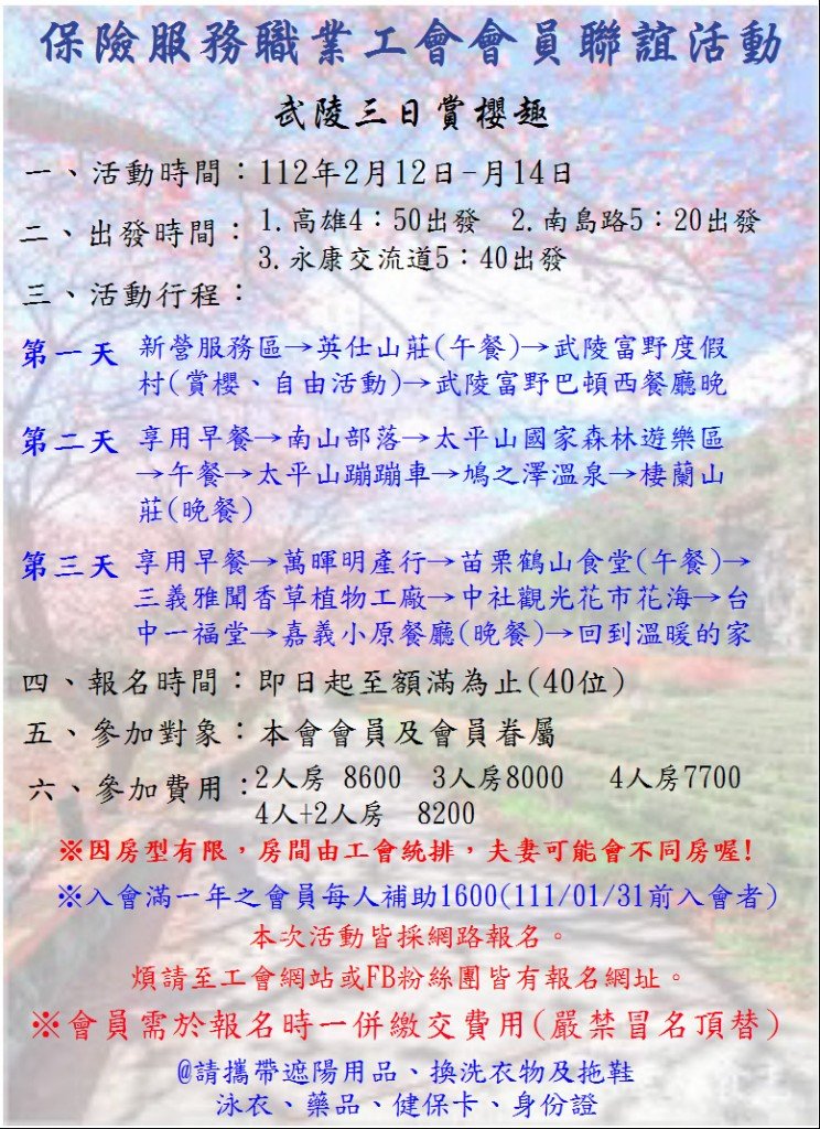 親愛的工會夥伴您好:本會訂於112/02/12-14舉辦【武陵三日賞櫻趣】,即日起開始報名至額滿為止,(本次活動皆採網路報名,煩請至工會網站或FB粉絲團皆有報名網址及詳細DM)。