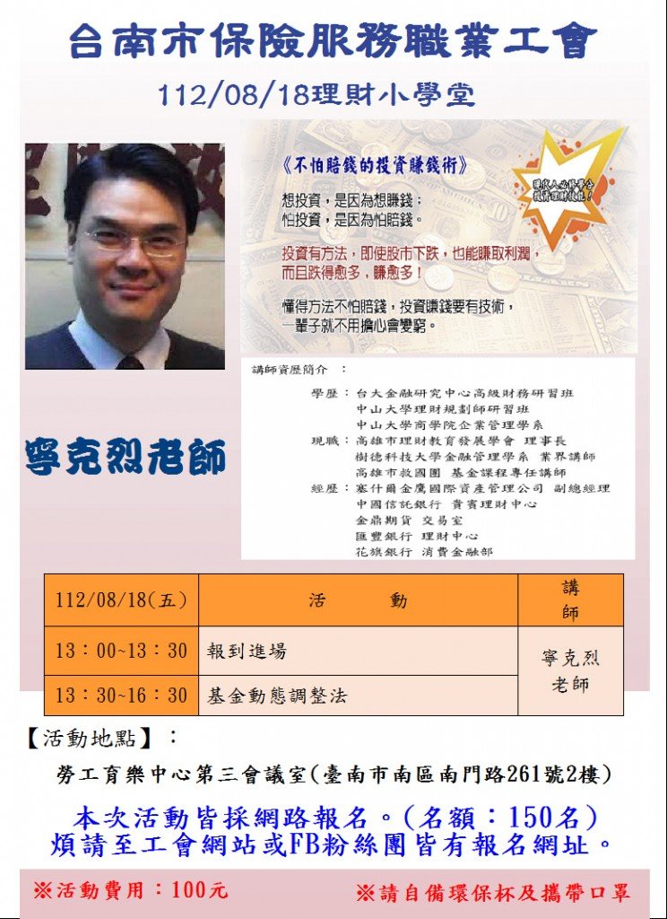 親愛的工會夥伴您好:本會訂於112/08/18辦理112年度(2)勞工教育講座,講師:寧克烈:【理財小學堂 (基金動態調整法)】因座位有限,即日起開始報名至額滿為止,(本次活動採網路報名,請至工會網站或FB粉絲團皆有報名網址及詳細DM)。
