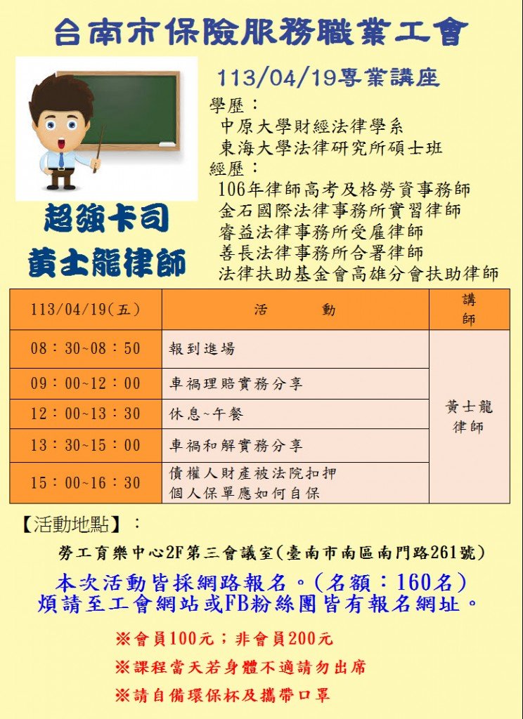 親愛的工會夥伴您好:本會訂於113/04/19辦理【113年度勞工教育講座,講師:黃士龍:車禍理賠實務分享/車禍和解實務分享/債權人財產被法院扣押個人保單應如何自保】因座位有限,即日起開始報名至額滿為止(本次活動皆採網路報名,煩請至工會網站或FB粉絲團皆有報名網址及詳細DM)。