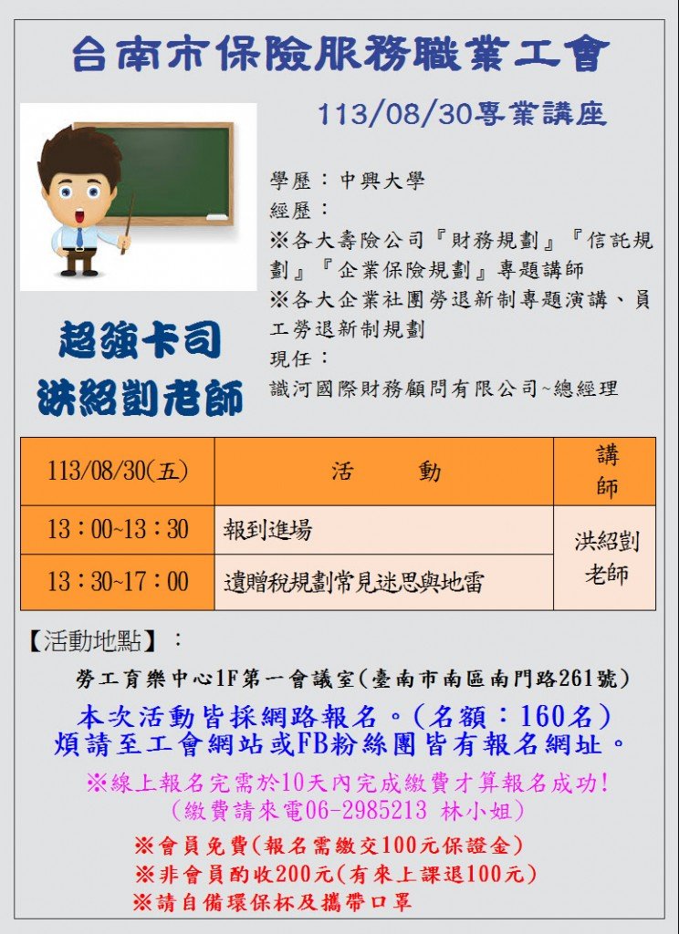 親愛的工會夥伴您好:本會訂於113/08/30辦理【113年度勞工教育講座,講師:洪紹剴:遺贈稅規劃常見迷思與地雷】因座位有限,即日起開始報名至額滿為止(本次活動皆採網路報名,煩請至工會網站或FB粉絲團皆有報名網址及詳細DM)。