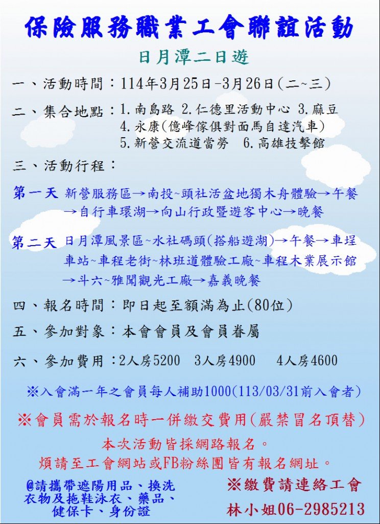 工會夥伴您好:本會訂於114/03/25~114/03/26日月潭二日遊,即日起開始報名至額滿為止,(本次活動皆採網路報名,煩請至工會網站或FB粉絲團皆有報名網址及詳細DM)。