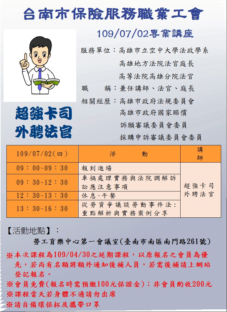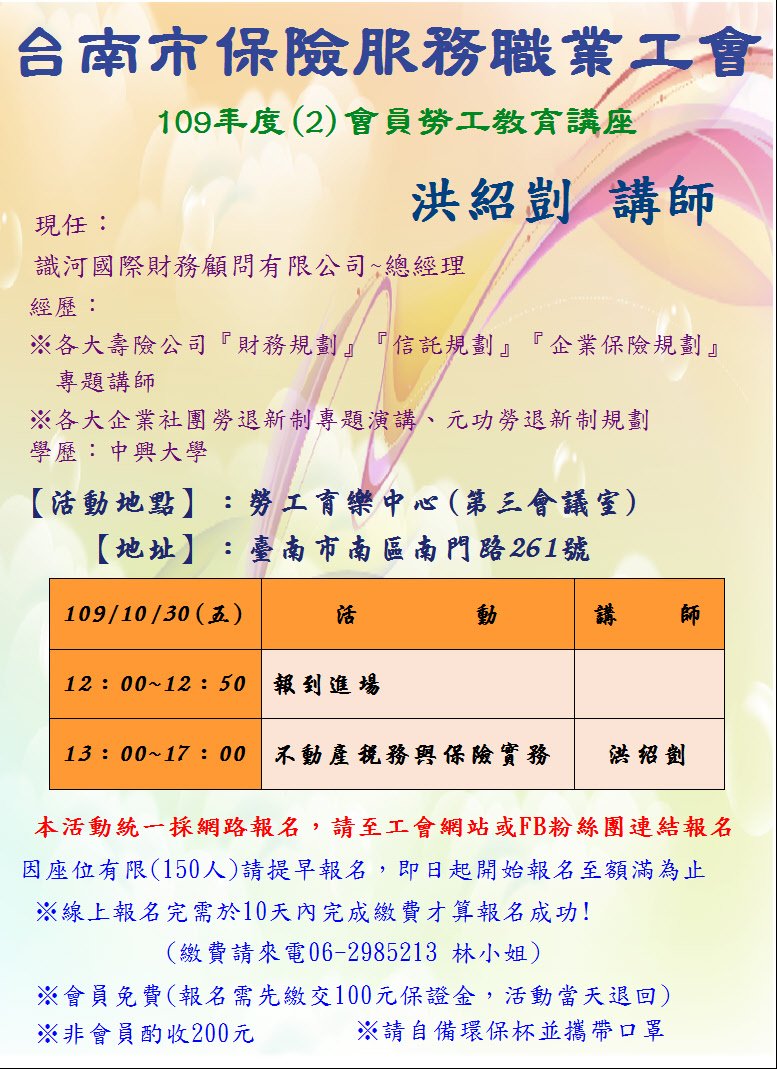 親愛的工會夥伴您好:本會訂於109/10/30辦理【109年度(2)勞工教育講... 觀看詳細